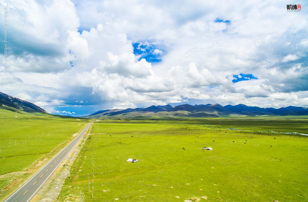 经幡飘扬在这个 五千多米的山口,周围是连绵的山脉还有雪山。垭口的风很大,气温低了很多,在这里连走路都会气喘吁吁。我们在这个海拔放飞无人机,第一次挑战这么高的海拔,还是有点胆战心惊的,幸好还是安全返航。广阔的绿色草甸和延绵的318国道看着让人心情舒畅。